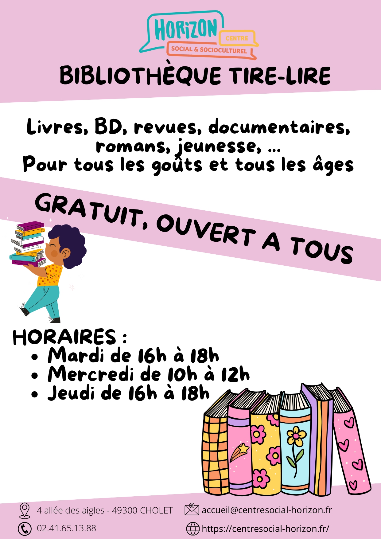 En partenariat avec la médiathèque Elie CHAMARD de la Communauté d’Agglomération du Choletais, le Centre Social propose un Point Relais Lecture « Tire-Lire » pour l’ensemble des habitants du secteur du Centre Social.